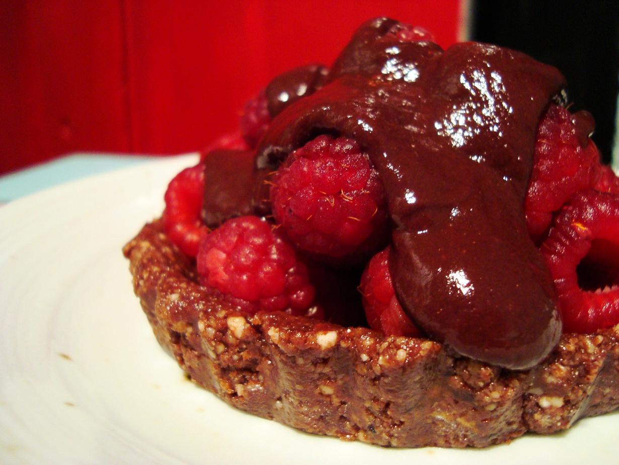 Pulse nuts in food processor until finely crumbly. Add cacao and pulse until well blended. Add dates and blend until it forms a dough. Press into pan, chill in fridge 15 min (or until ready to serve). Fill with raspberries, drizzle chocolate sauce on top and serve.